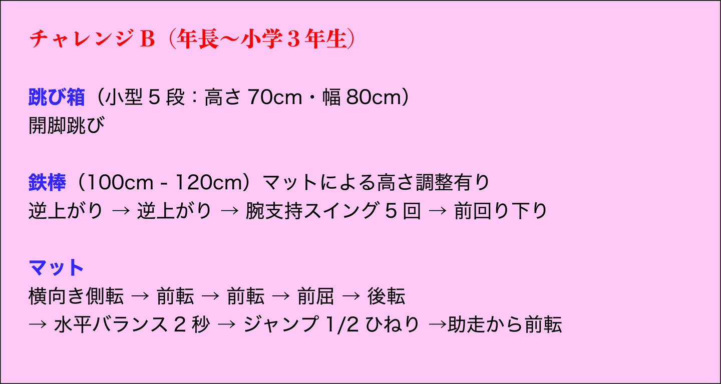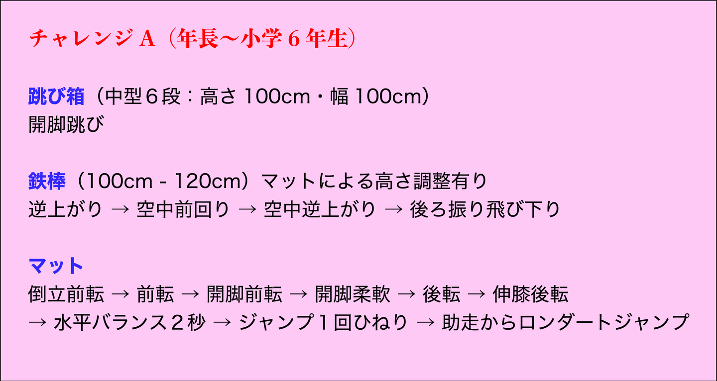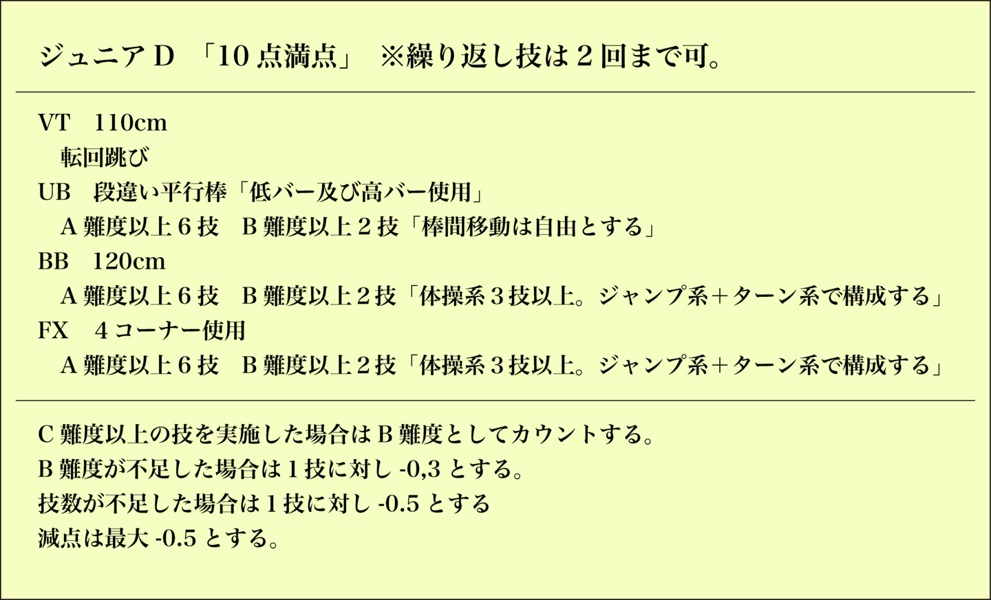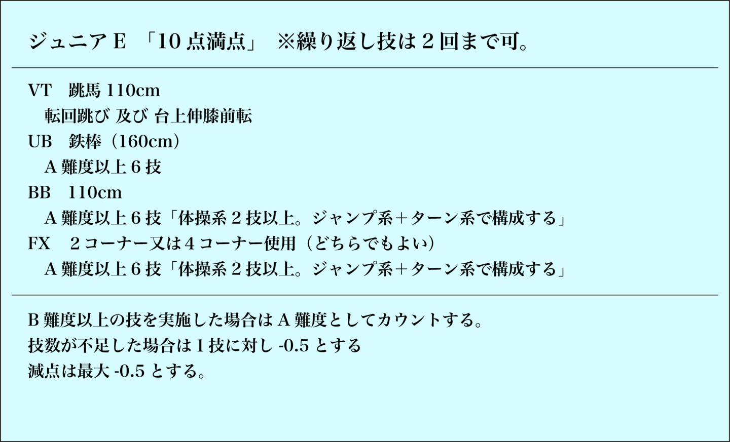 ※跳馬の高さはジュニア A・B・C(125cm)に限り身長に合わせて低くすることを可能とする。ジュニア D・E(110cm)は固定。